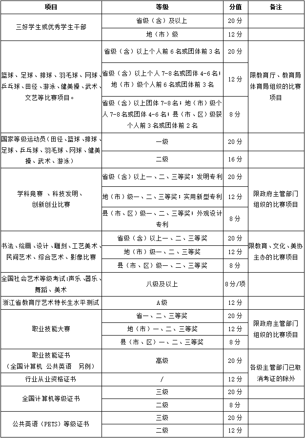 注:各项比赛及三好学生、优秀干部的荣誉证书均限在高中阶段获取的。
