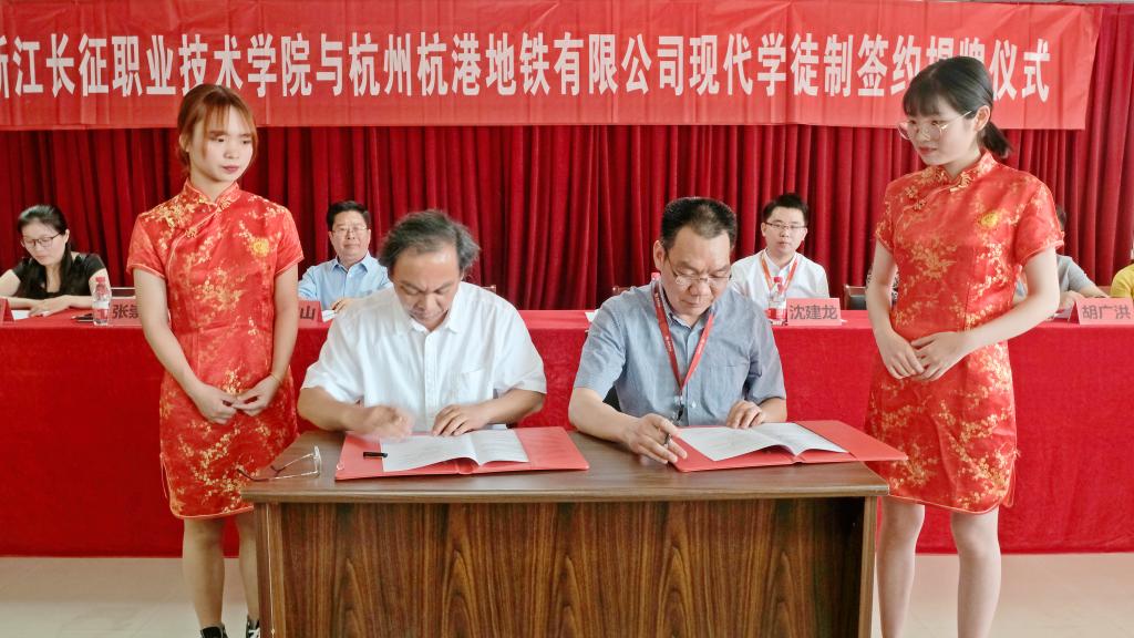 随后,王其军书记和杨春芳书记代表双方签订了“校企合作人才培养协议”,并与我校学生签订定向培养三方协议书;而后共同为“现代学徒制杭港地铁班”、“校企协同培养应用性人才基地”揭牌,开启我校与杭州杭港地铁有限公司合作的新篇章,为经济社会发展贡献我们的力量。