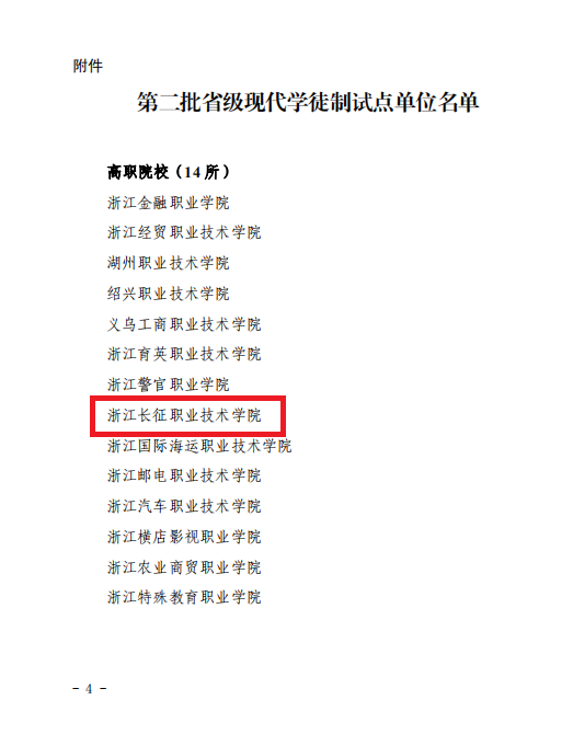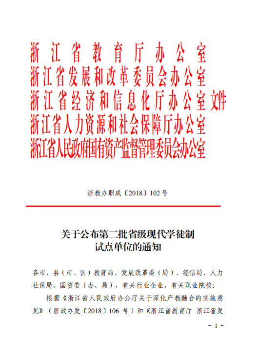 近日,根据浙江省教育厅办公室、浙江省发改委办公室、浙江省经信委办公室、浙江省人力社保厅办公室、浙江省国资委办公室联合印发《关于公布第二批省级现代学徒制试点单位的通知》(浙教办职成〔2018〕102号),我校成功获批浙江省第二批现代学徒制试点单位。这标志着我校在产教深度融合、校企协同育人、创新人才培养、提升人才培养质量等方面进入了新的高层次发展阶段。