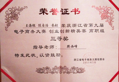 2015年1月9日,浙江省第九届电子商务大赛创新创业精英赛决赛在之江饭店举行。我院商务系电子商务专业学生陈自浩、袁超、王海栋撰写樊西峰老师指导的创业项目《我的社区APP》荣获三等奖。