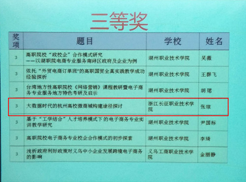 2015年1月17日,浙江省高职高专经济管理教指委电商分指委在湖州职业技术学院召开了2015年第一次教指委会议。会议的主题是“政校企合作,推动电商教学”,会议进行了论文征集和评比。我院电子商务专业樊西峰老师提交的论文“校企合作以工作室为主线的电商团队输出人才培养模式实践与思考”荣获二等奖,张琼老师提交的论文“大数据时代的杭州高校微商城构建途径探讨”荣获三等奖。(商务系供稿)