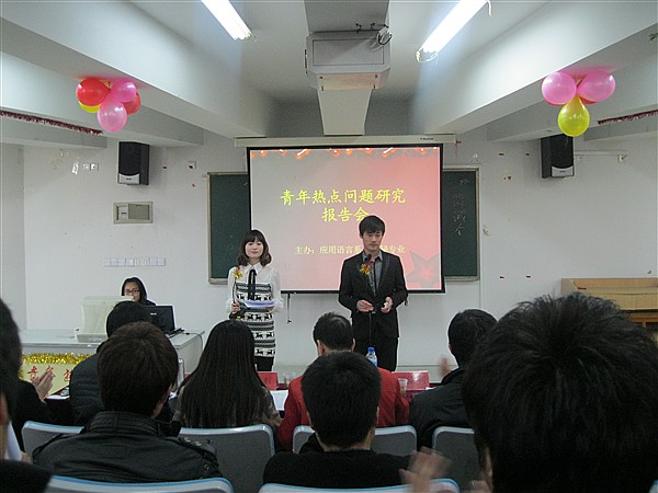 12月22日下午,应用语言系文秘专业在1218教室举办了“青年热点问题研究”报告会,语言系系主任张崇利、党总支书记杨军、报告会指导老师杨瑞等10名老师及语言系学生会干部、各班代表和文秘专业全体学生参加了本次报告会。