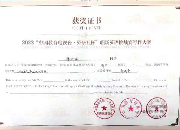2022年“外研社杯”浙江省高职高专大学生英语能力挑战赛写作大赛于近日隆重举行。此次比赛以线上形式开展,经过激烈角逐,我校人文与教育学院商务英语专业的阮云康同学荣获一等奖(指导老师:叶磊),汽电专业的韩昕晖同学(指导老师:杨成青)和网络新闻与传播专业的王筱岑同学(指导老师:赵素君)荣获三等奖。