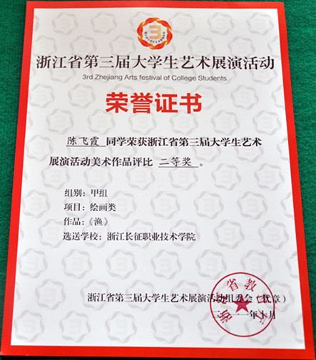 为展现我省大学生朝气蓬勃的青春风貌和高等学校艺术教育成果, 我省举办了主题为“青春•使命”的第三届浙江省大学生艺术展演活动。活动形式精彩纷呈,经过层层评选,我院选送的陈飞霞同学的绘画类作品《渔》荣获本届大学生艺术展演活动美术类作品评比二等奖,充分体现了我院健康高雅的校园文化成就和长征学子积极进取、卓尔不群的青春风采!